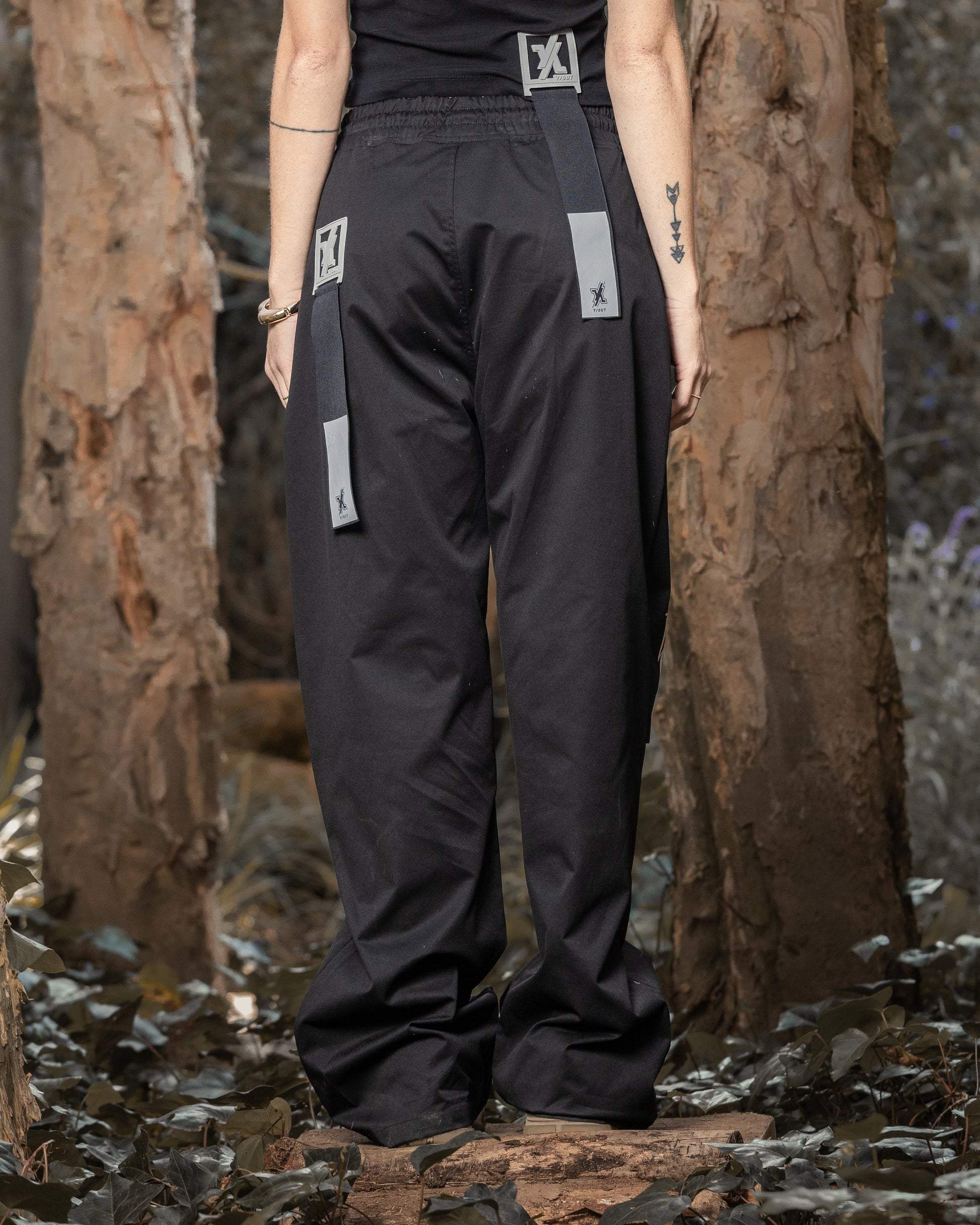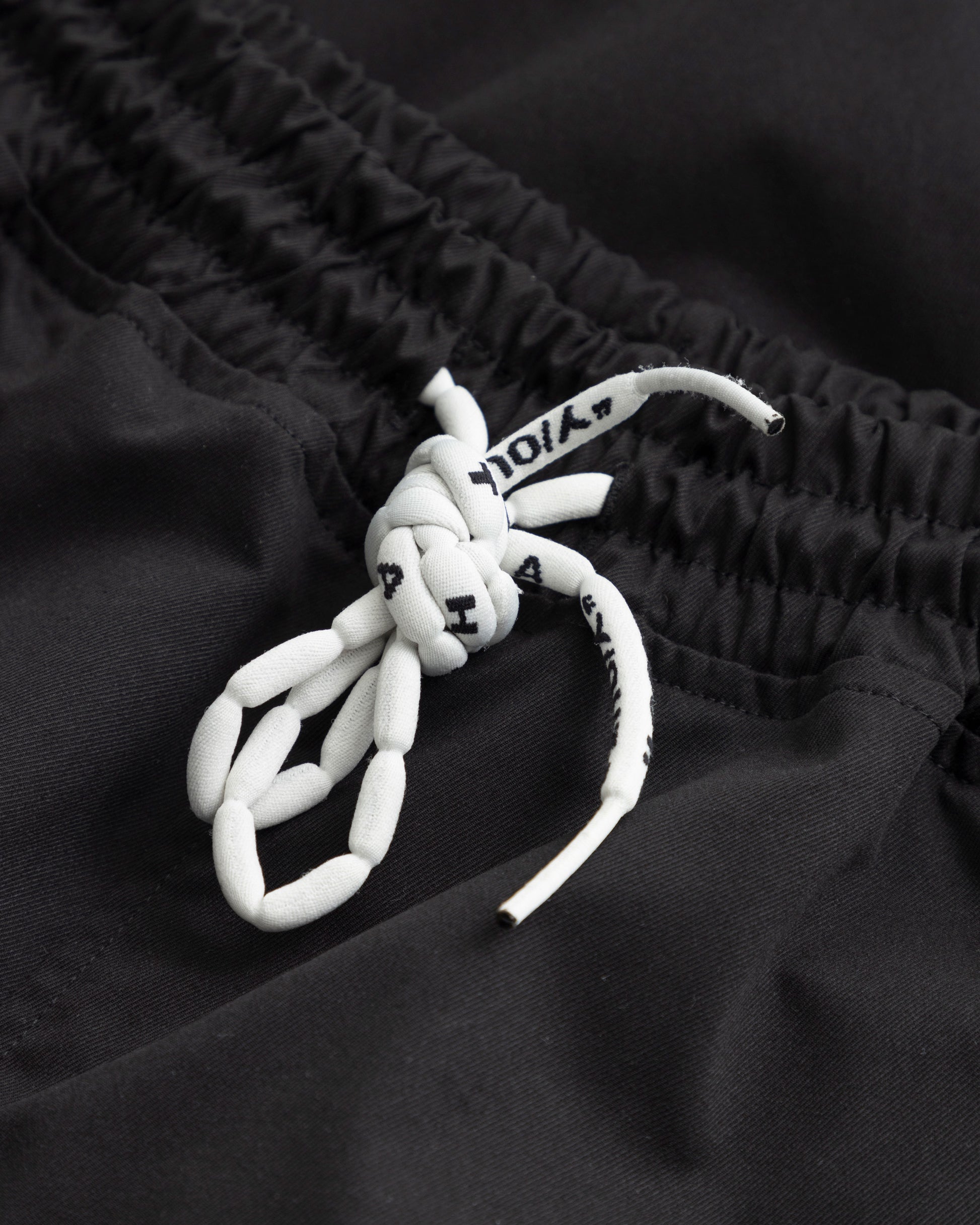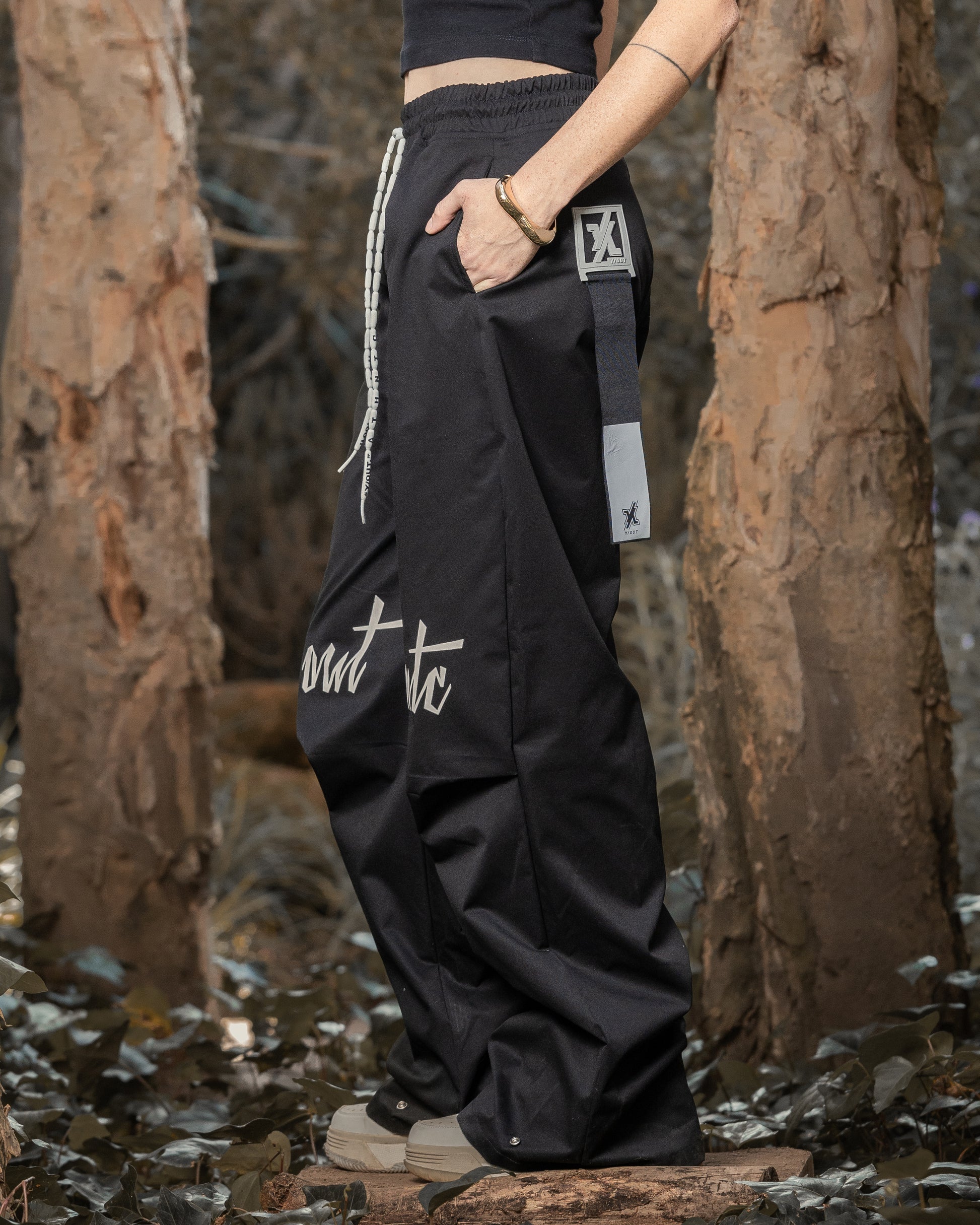 Pretina elástica con cordón y detalle de marca “Y/OUT.”