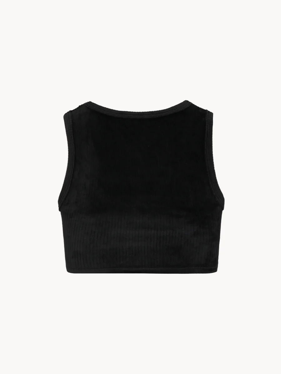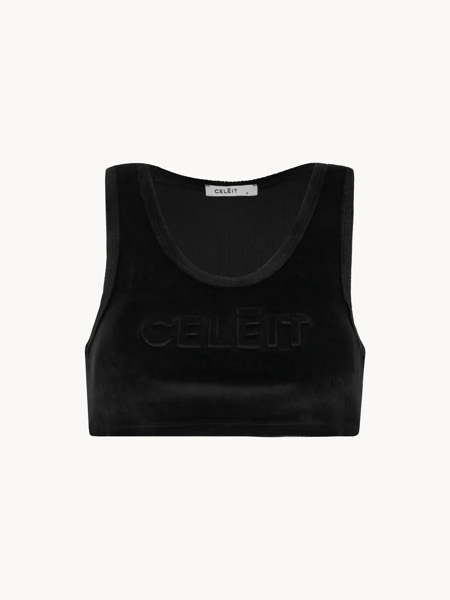 Este crop top negro es la combinación perfecta entre estilo y comodidad. Con un diseño de corte slim fit y manga sisa, su textura aterciopelada aporta un acabado sofisticado y moderno. El logo CELEĪT repujado tono a tono en el frente le da un toque distintivo y minimalista, ideal para looks urbanos o deportivo. Confeccionado en una mezcla de poliéster y spandex, su ajuste es cómodo, suave al tacto y se adapta al cuerpo de forma natural.