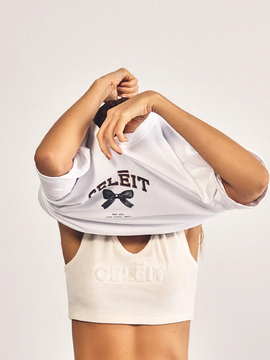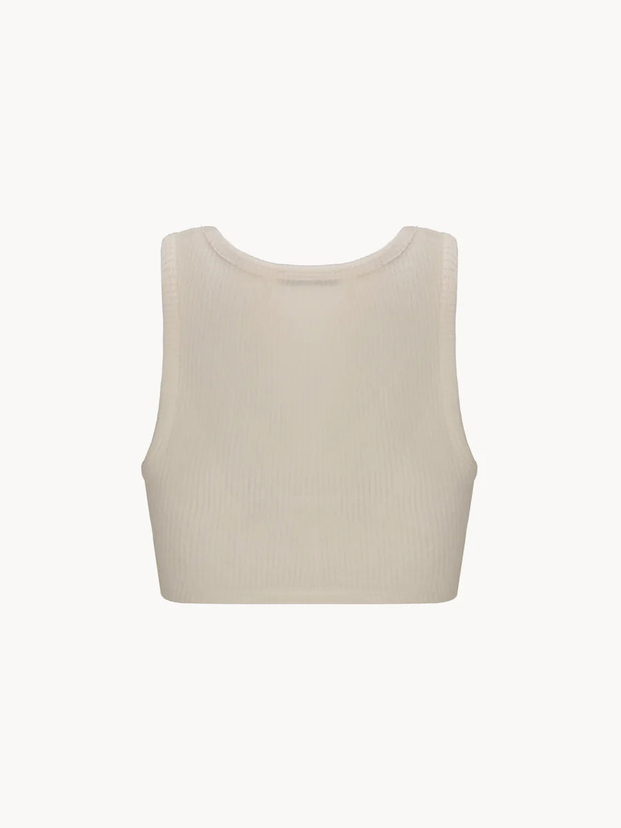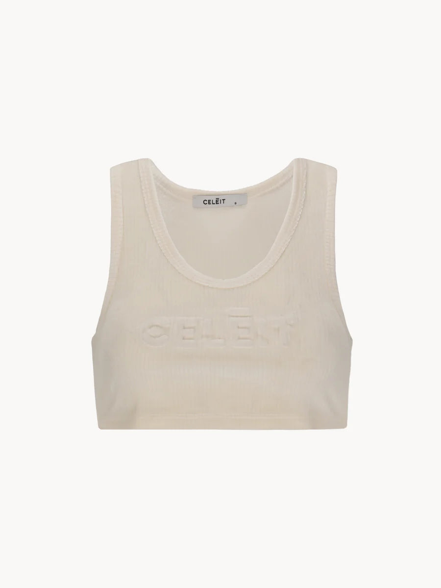 Este crop top en tono ivory es una pieza esencial con un toque moderno y sofisticado. Su diseño slim fit y manga sisa resaltan la silueta, mientras que el acabado aterciopelado le aporta una textura suave y elegante. El logo CELEĪT repujado tono a tono en el frente le da identidad sin perder minimalismo. Ideal para combinar con prendas de tiro alto o como capa base en outfits urbanos.