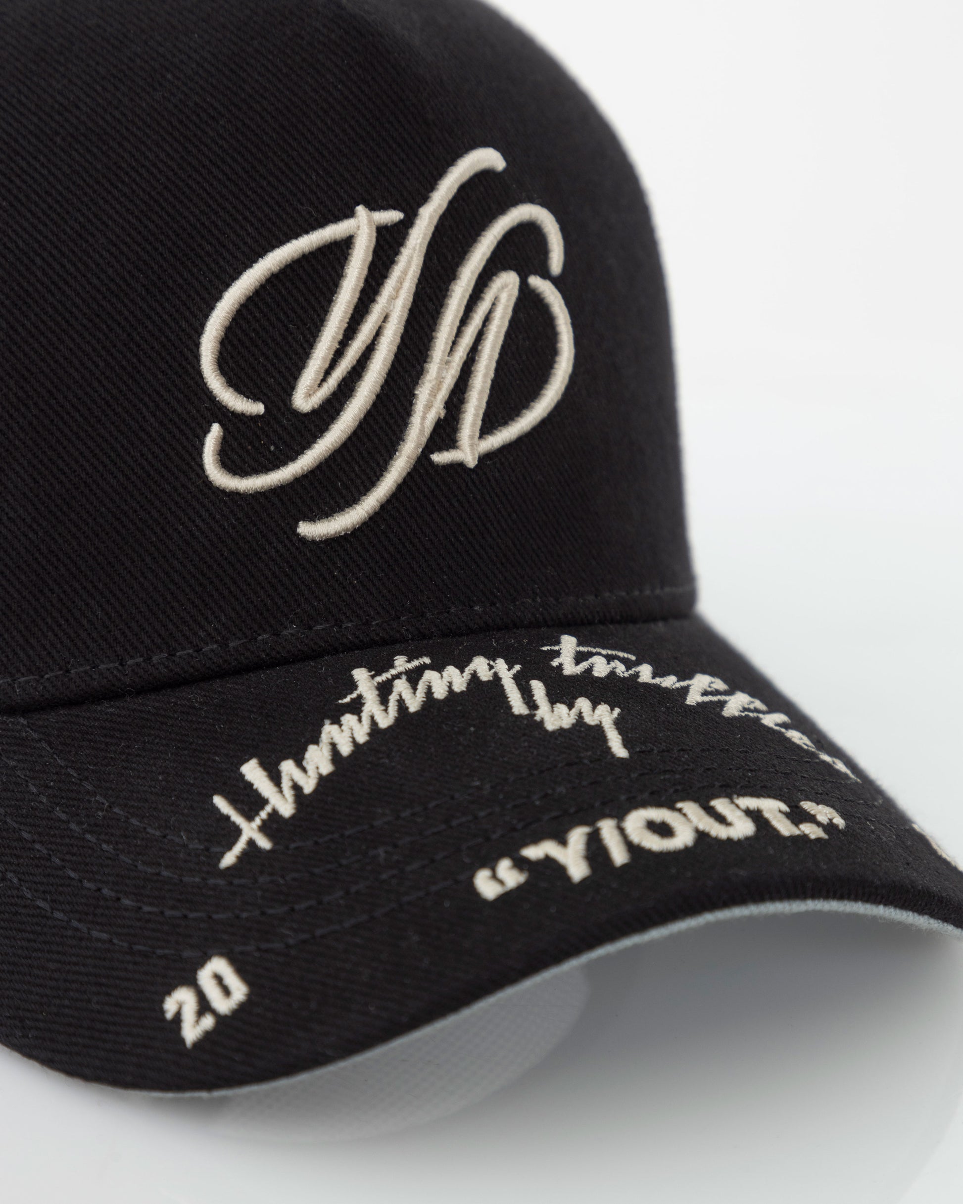 Detalles bordados en tonos crudos: logo Y/OUT y textos inspiracionales
