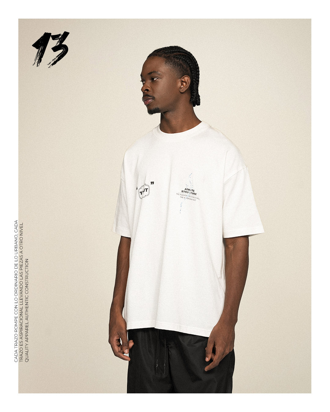 Confeccionada en algodón de 280 g, presenta un acabado premium con estampado en serigrafía de alta definición al frente y en la espalda. Su silueta oversize aporta amplitud y movimiento, mientras el color ivory realza el contraste de los detalles gráficos.
