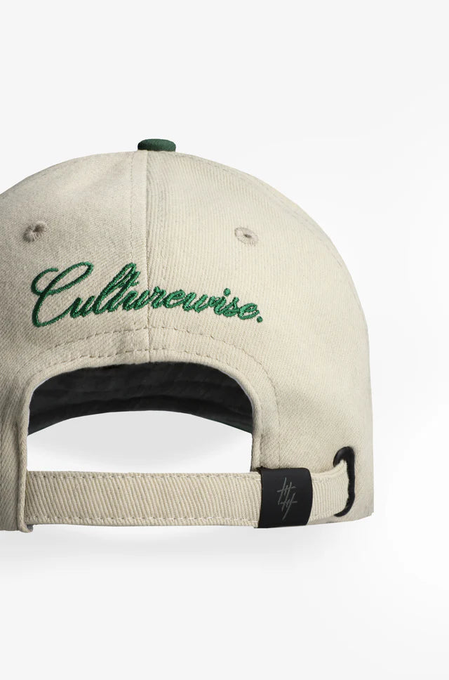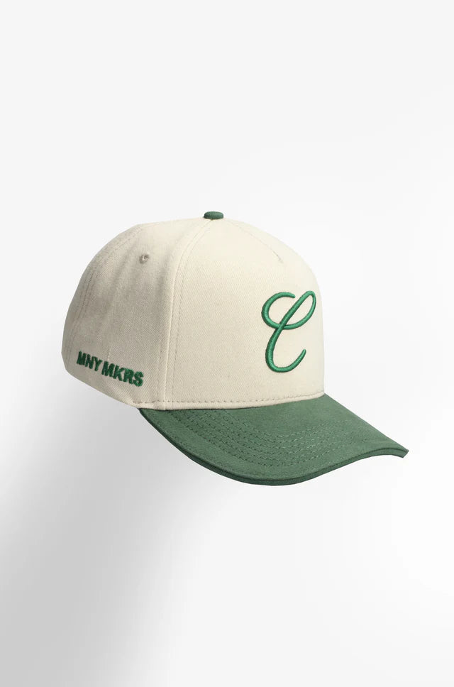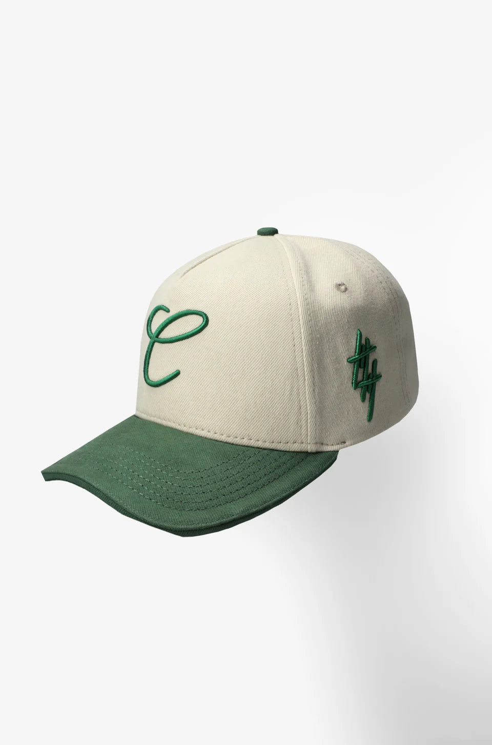 Bordado frontal en alto relieve: la inicial “C” en verde, limpia y reconocible.