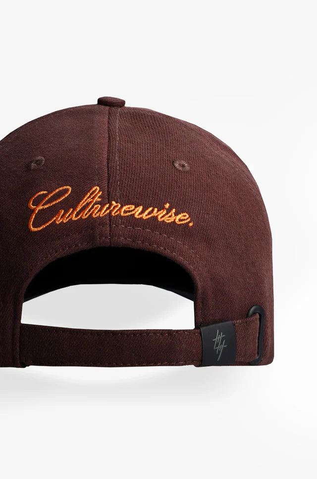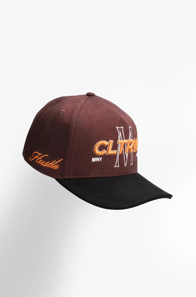 Bordado 3D en alto relieve: el logo CLTRW (Culturewise Money Makers) en hilo naranja quemado contrasta con la gran “M” blanca.
