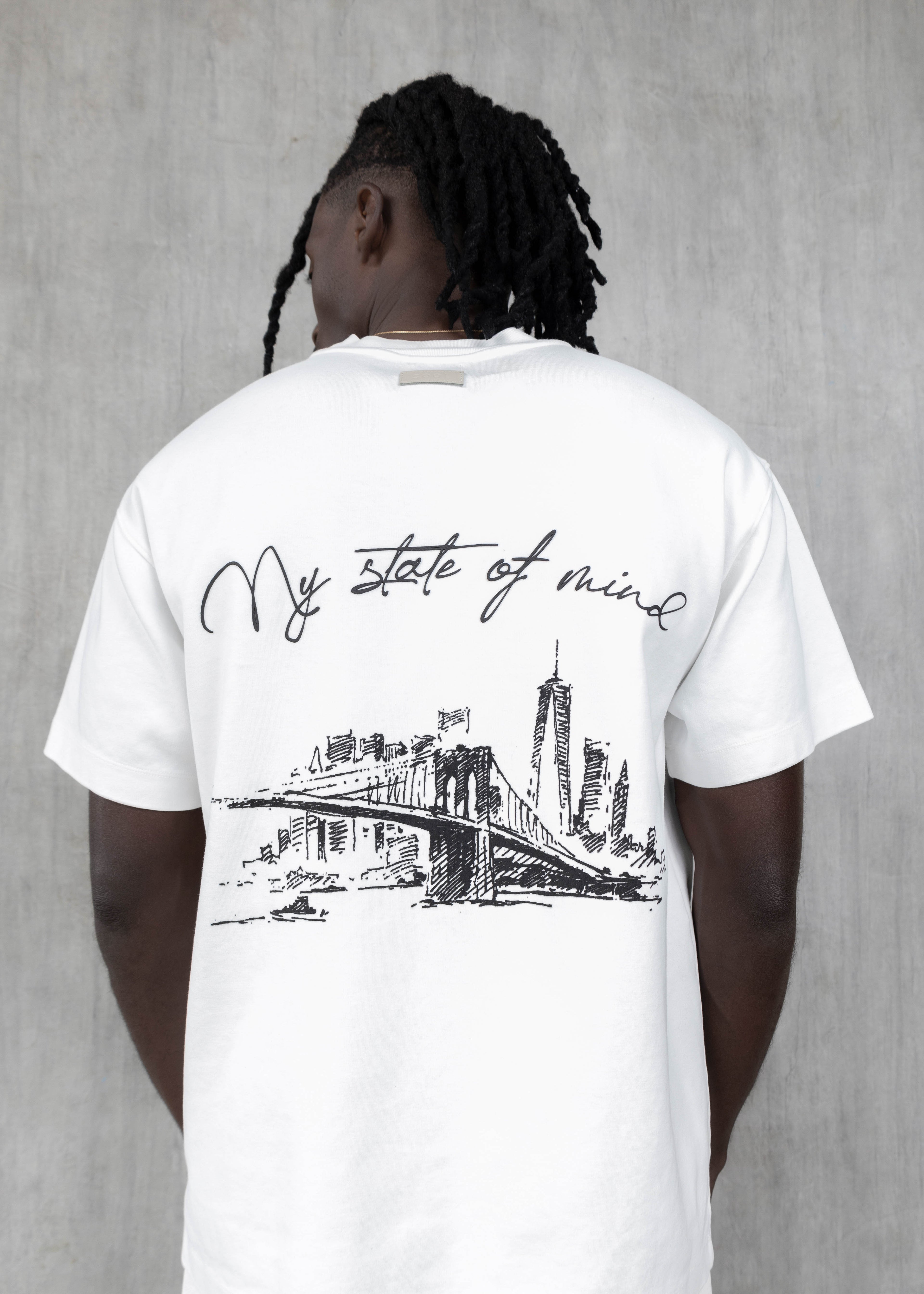 Explora la esencia de Nueva York con esta camiseta unisex en tono marfil, diseñada para destacar con sobriedad y actitud urbana. Confeccionada en algodón premium de 350 gramos, ofrece una textura firme y de alta calidad. Su parte frontal presenta un logo minimalista bordado, mientras que en la espalda luce una ilustración artística del icónico puente de Brooklyn acompañada de la frase “NY State of Mind” en tipografía manuscrita, en un estampado de alta densidad que eleva el diseño a una expresión auténtica de estilo y cultura.