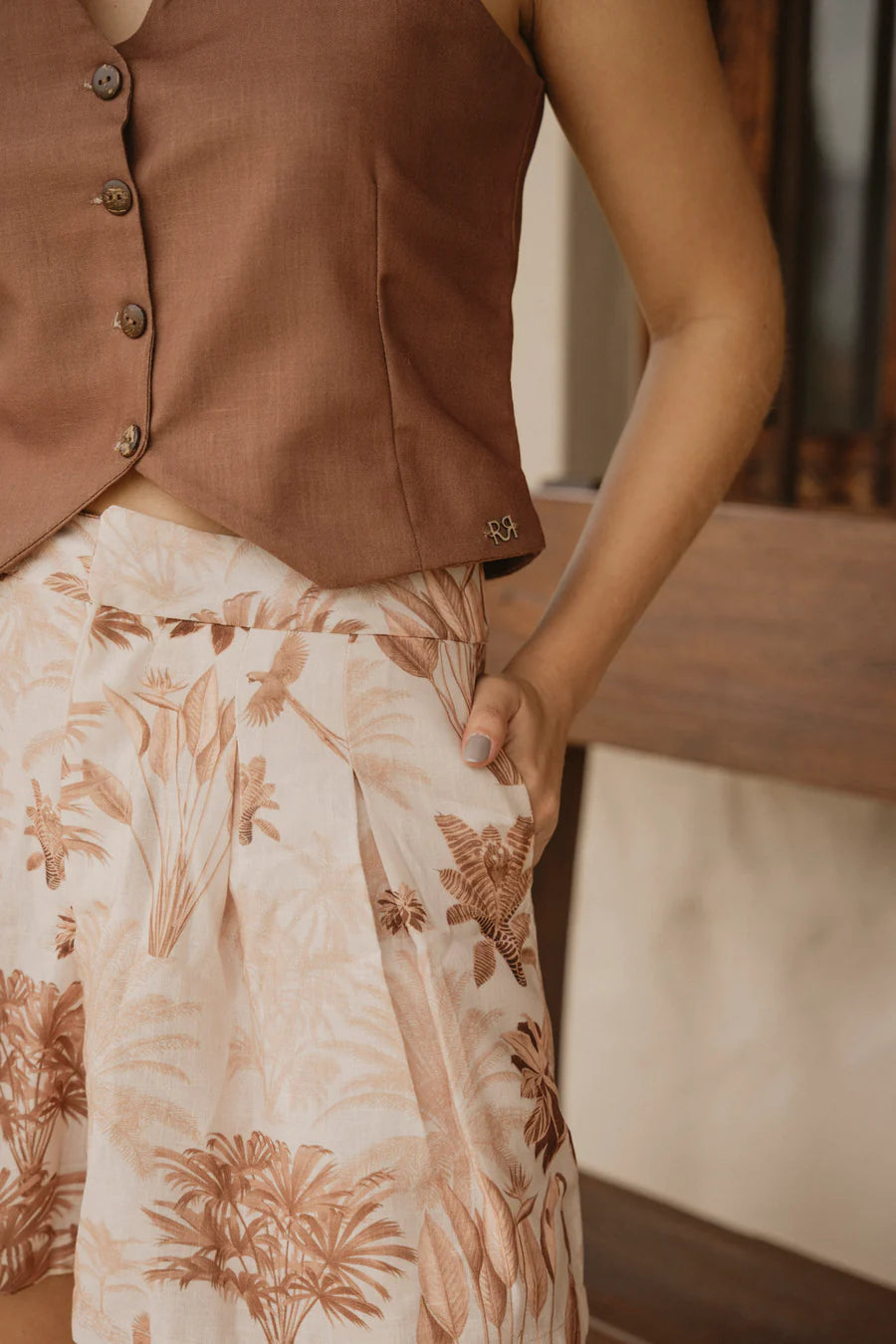 Set flora compuesto de chaleco en color mocha mousse con botones en coco y short estampado tiro medio.