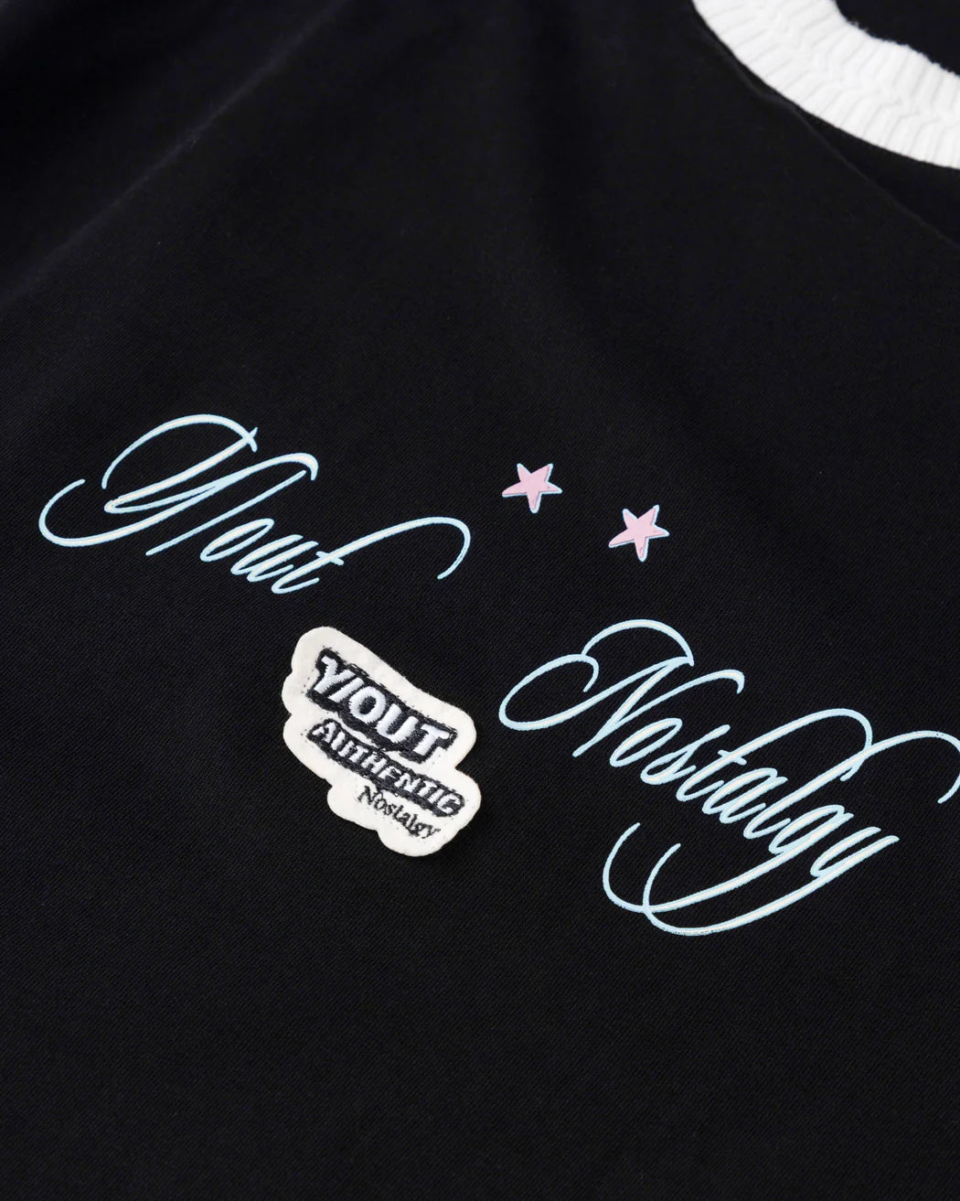 Gráfica “Y/Out Nostalgic” al frente en print celeste pastel y parche bordado de felpa que aporta textura premium.
