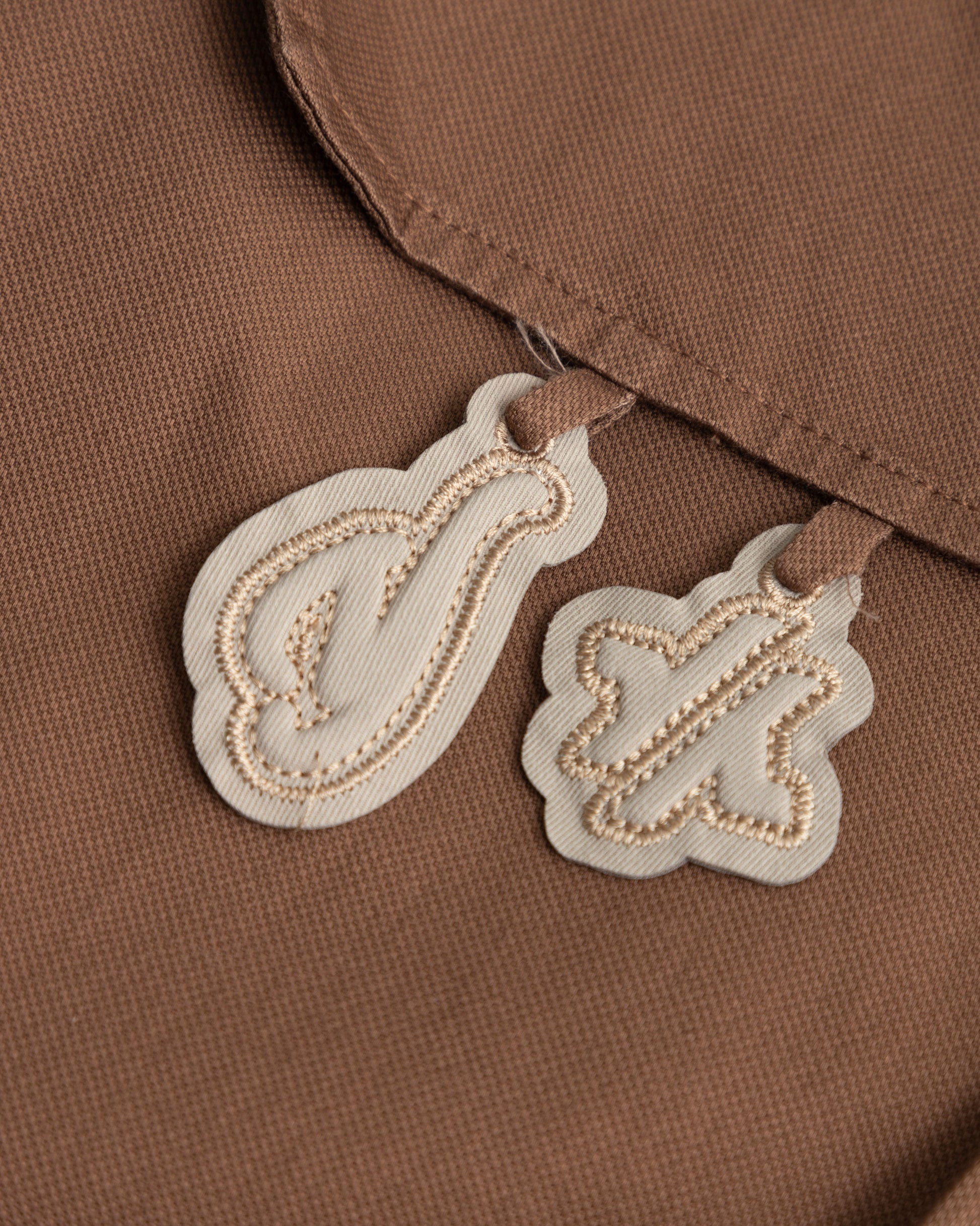 Bordados colgantes “Y/OUT”, “x” y “paisley” en tonos beige