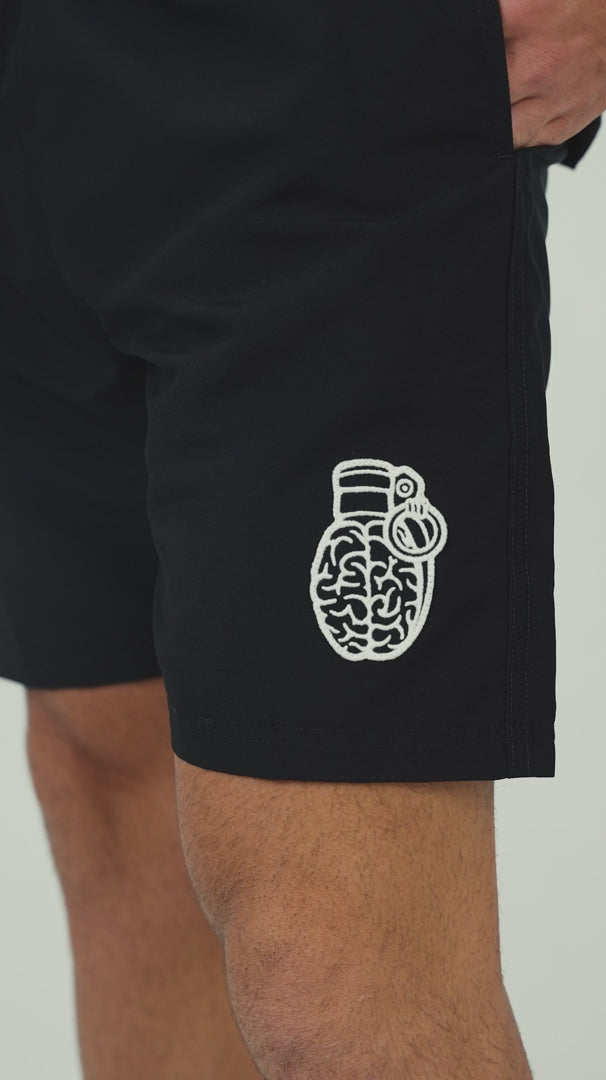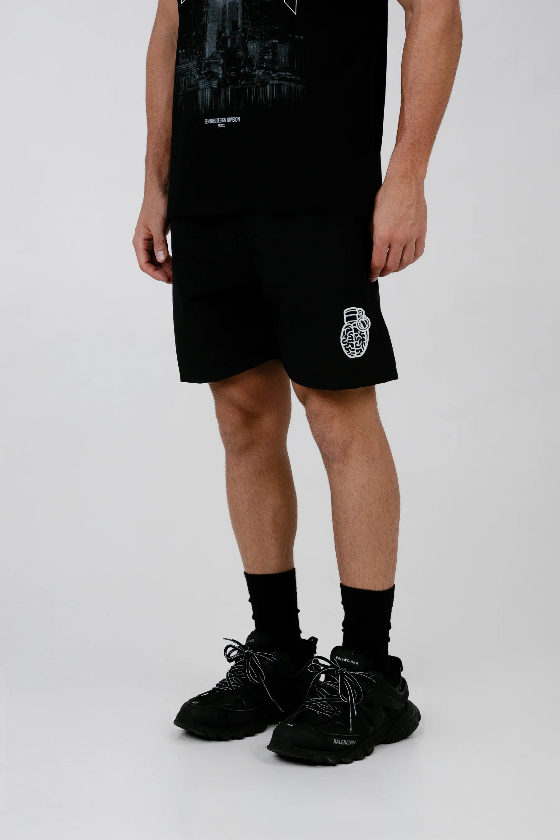 Short negro. Cintura ajustable con cordón blanco. Granda en la parte inferior izquierda. Bolsillos delanteros y uno trasero.