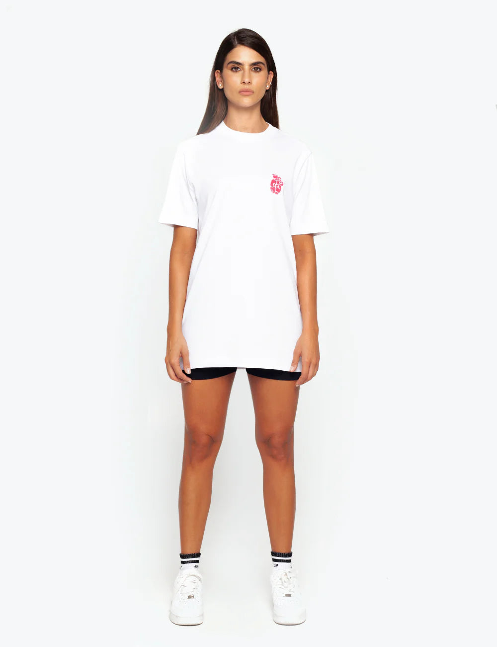 Camiseta blanca de manga corta, confeccionada en material suave y duradero. Presenta un diseño en la parte frontal izquierda de una granada color rosada y en la parte trasera superior el texto de BLOW UP.